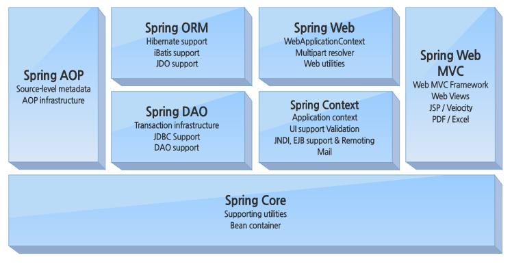 Spring의 구조는 위와 같고 AOP, DAO, Context, Web.. 등의 장점을 가진다고 한다. 용어에 대해서는 앞으로 천천히 작성해 볼 예정이다.