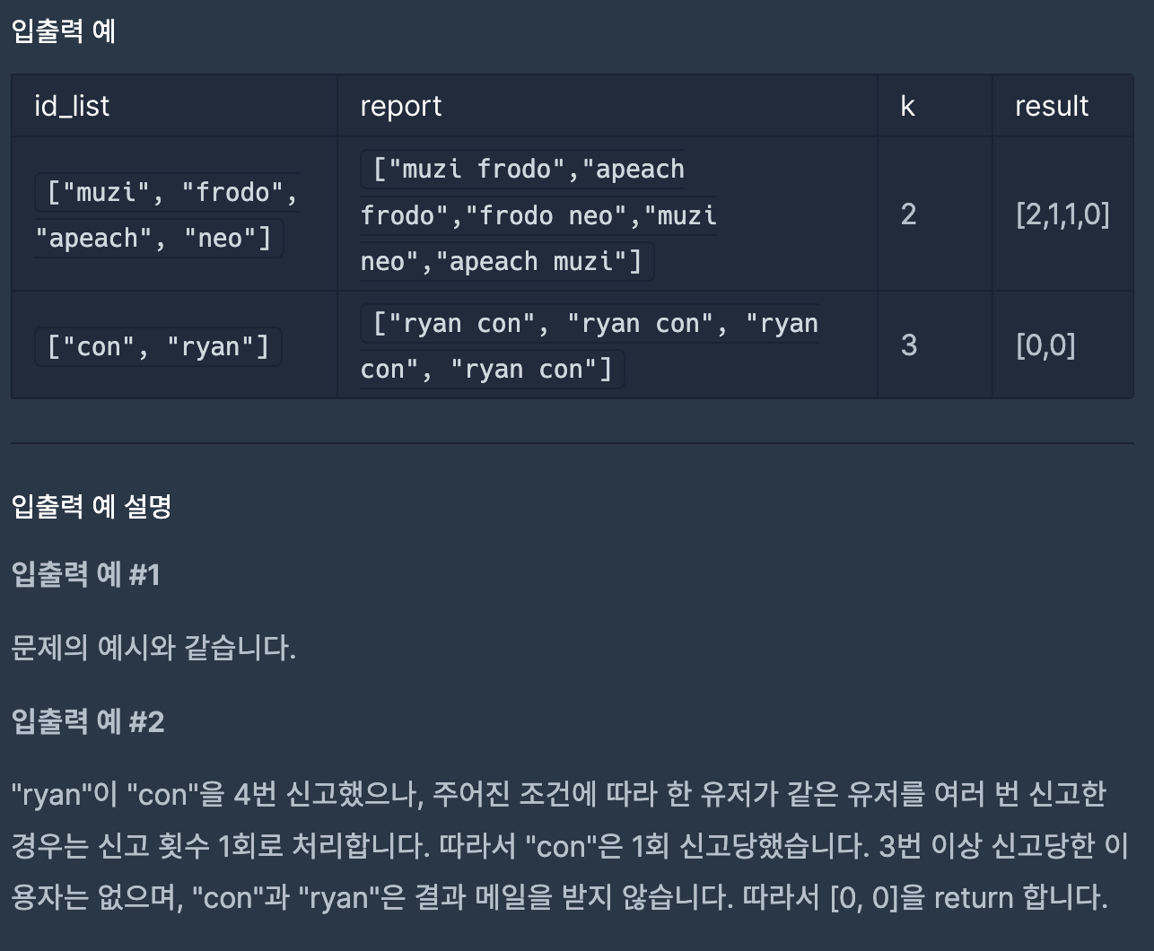 - report의 원소는 "이용자id 신고한id"형태의 문자열입니다.