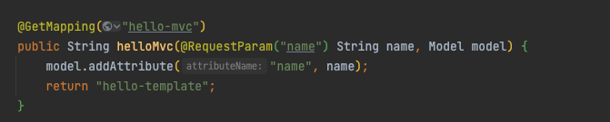hello-mvc 컨트롤러에서 Model 속성을 정의하고 hello-template을 리턴하면