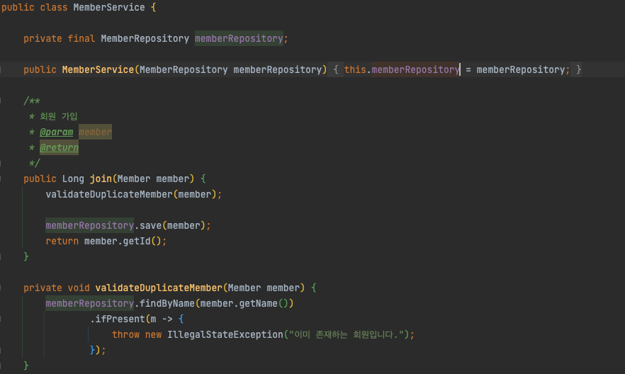 MemberService의 join은 우선 이름 중복검사를 한 후에, map 에 member를 저장하는 기능을 제공한다.