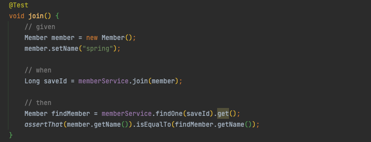 Junit 에 포함되어있는 Assertions 의 assertThat().isEqualTo() 함수를 통해 처음에 만든 멤버의 이름이 존재하는지 검사하는 테스트이다.