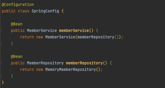 코드로 작성할 경우에는 Config 파일에서 개발자가 직접 필요한 클래스를 주입시키기 때문에 (memberRepository 등)