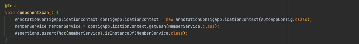 테스트 코드 작성을 통해 ComponentScan을 통해 @Component를 명시한 클래스가 자동 주입되는지 확인할 수 있다.