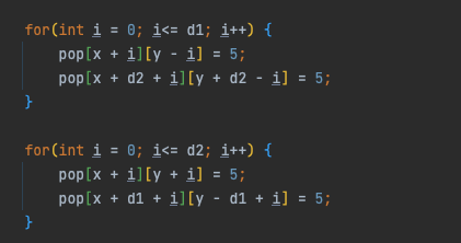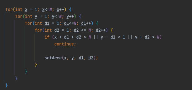 우선 x, y, d1, d2 의 값을 1부터 천천히 늘려 나가면서 모든 경우를 탐색해야하며 4중 for 문으로 시작했다.