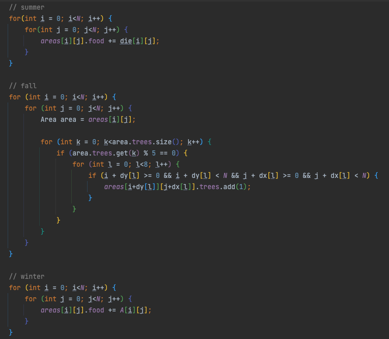 땅의 양분과 나무 정보를 저장할 Class 객체를 하나 만들고 봄 ~ 겨울을 차근차근 진행해나가면 된다.