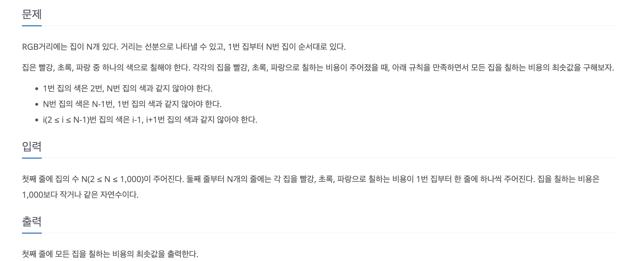 첫째 줄에 집의 수 N(2 ≤ N ≤ 1,000)이 주어진다. 둘째 줄부터 N개의 줄에는 각 집을 빨강, 초록, 파랑으로 칠하는 비용이 1번 집부터 한 줄에 하나씩 주어진다. 집을 칠하는 비용은 1,000보다 작거나