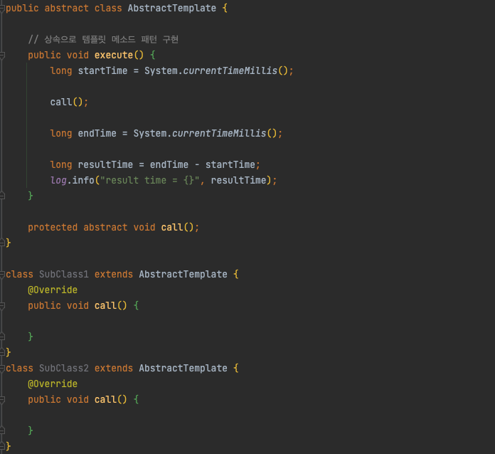상위 클래스 (Abstract Class) 에서 기능의 템플릿, 틀 을 정의하고 하위 클래스에서 그것을 상속하여 실제 기능을 구현하는 패턴이다.