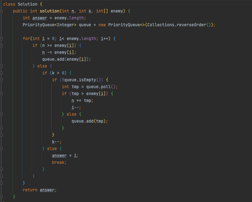 준호가 처음 가지고 있는 병사의 수 n, 사용 가능한 무적권의 횟수 k, 매 라운드마다 공격해오는 적의 수가 순서대로 담긴 정수 배열 enemy가 매개변수로 주어집니다. 준호가 몇 라운드까지 막을 수 있는지 return 하도록 solution 함수를 완성해주세요.