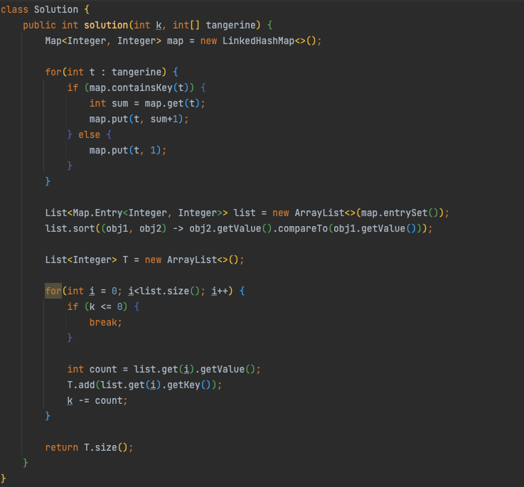경화가 한 상자에 담으려는 귤의 개수 k와 귤의 크기를 담은 배열 tangerine이 매개변수로 주어집니다. 경화가 귤 k개를 고를 때 크기가 서로 다른 종류의 수의 최솟값을 return 하도록 solution 함수를 작성해주세요.