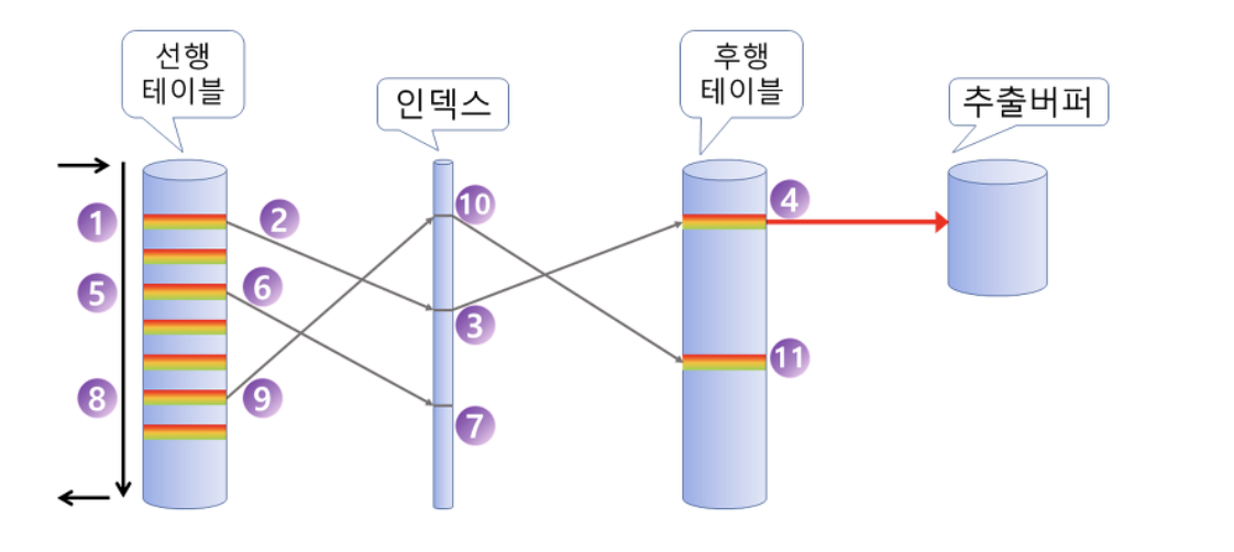 2. 찾은 행에 대해서, 선행 테이블의 조인 키를 기준으로 데이터 정렬