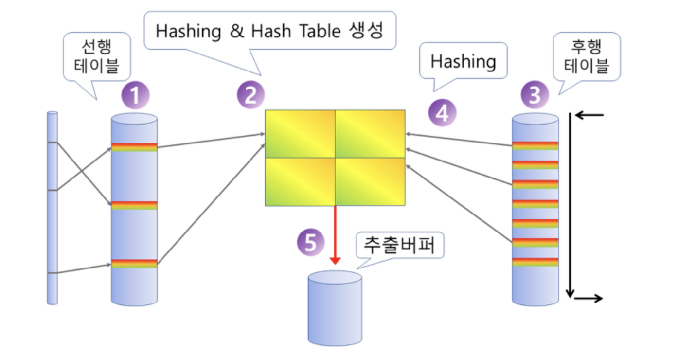 해싱과 해시테이블을 이용해 두 테이블을 조인하는 형태