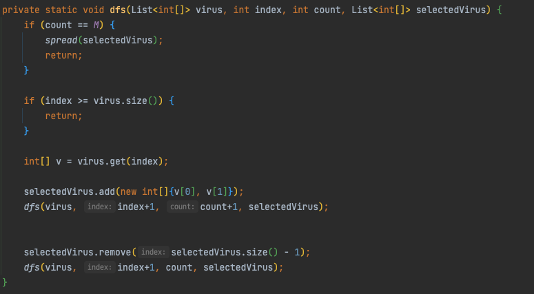 private static void dfs(List<int[]> virus, int index, int count, List<int[]> selectedVirus) {