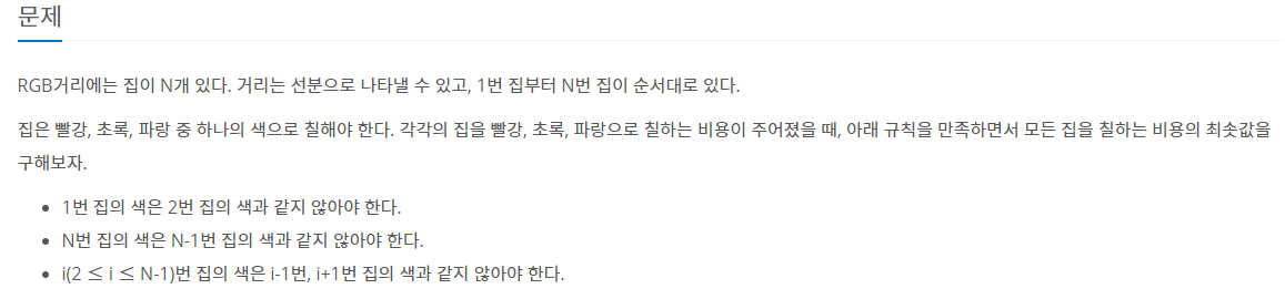 색은 총 3가지 이며 N개의 집을 칠할 때 최소값은